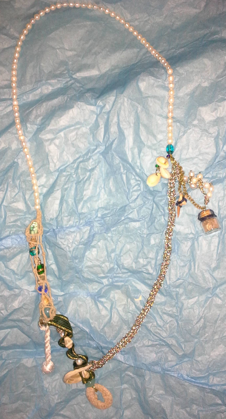 I’ll give it to her tonight. Sort of a “you can do it,” kind of thing. There’s seashells and a shark’s tooth and freshwater pearls and a holed stone (really big ones were and still are used as anchors) a small monkey’s fist (mariner’s knot), some glass beads to represent the glass buoys they used for nets, a green ribbon to stand in for seaweed… kitschy stuff like that.